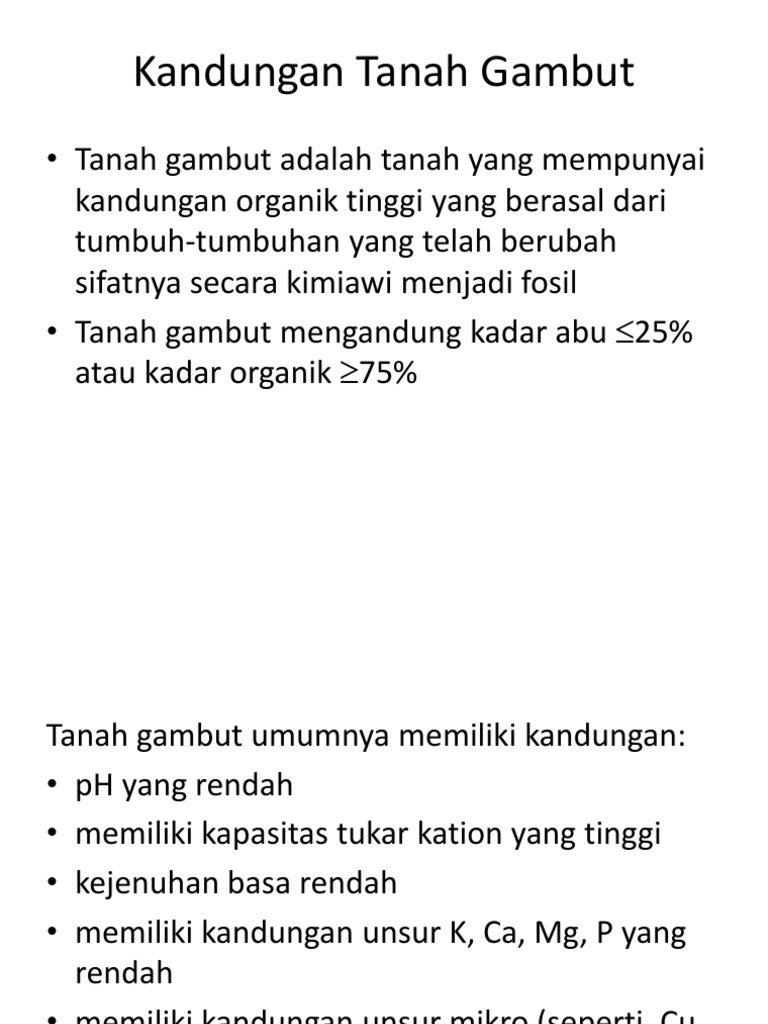Tanah gambut ini merupakan hasil dari tanaman yang pembusukannya tidak sempurna, sehingga memiliki kandungan bahan organik yang sangat tinggi.